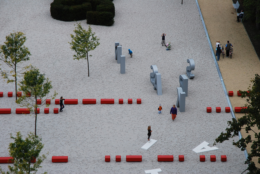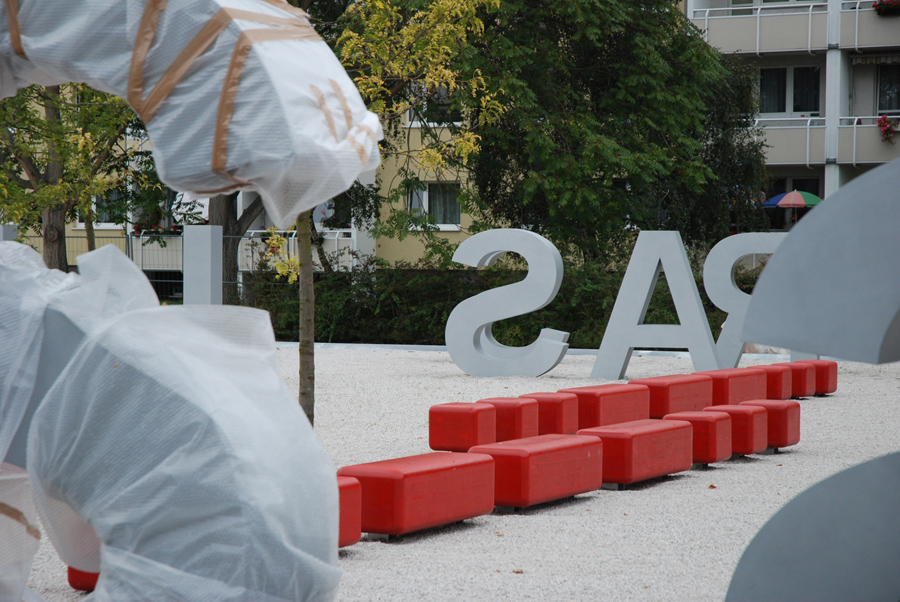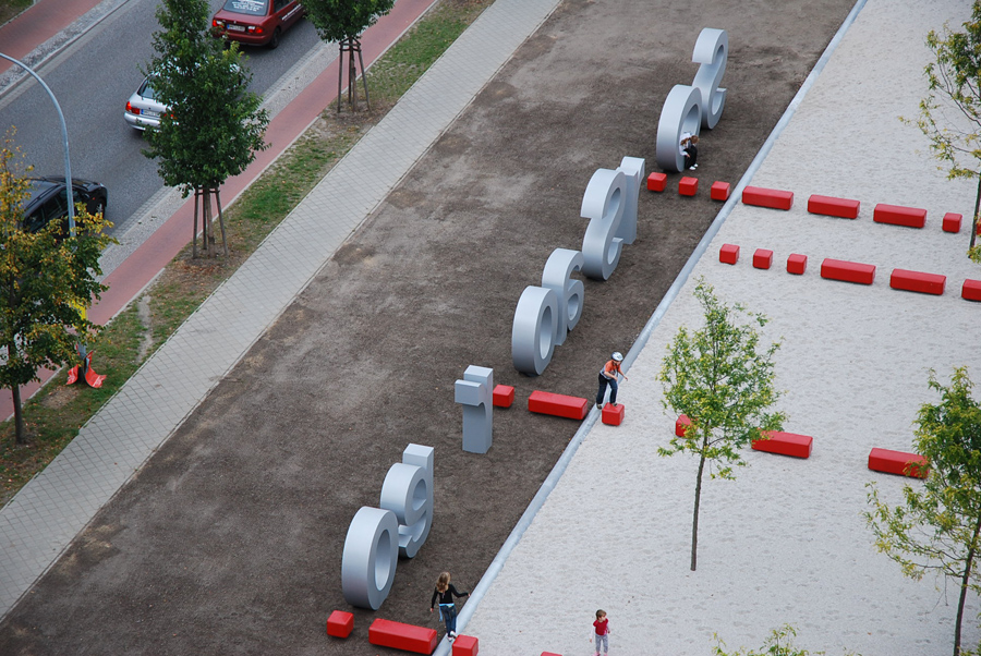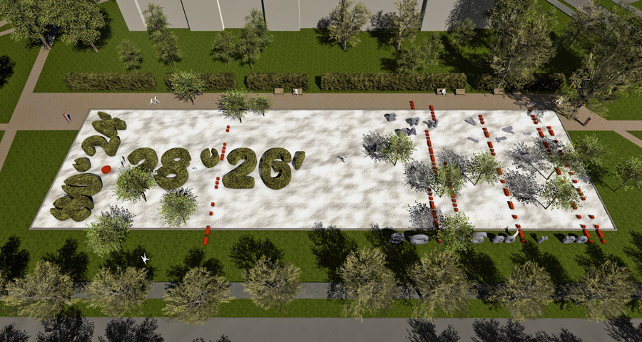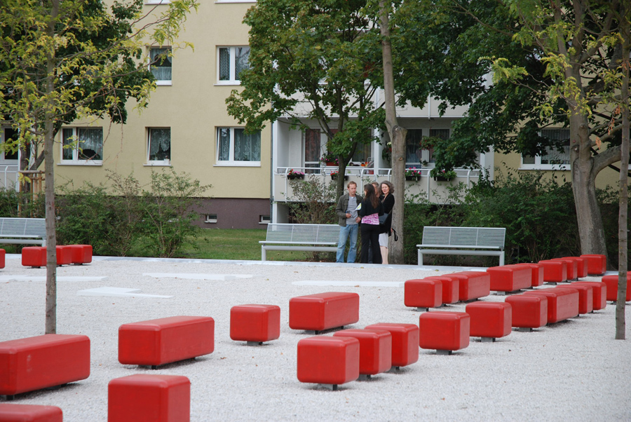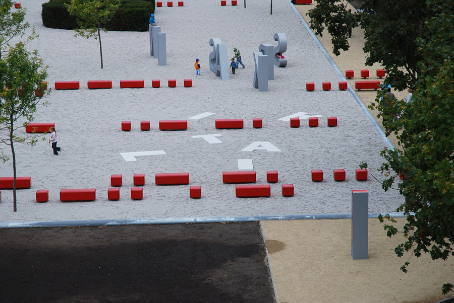 Die Stellung der roten Bänke im Freiraumprojekt entspricht dem Morsecode.