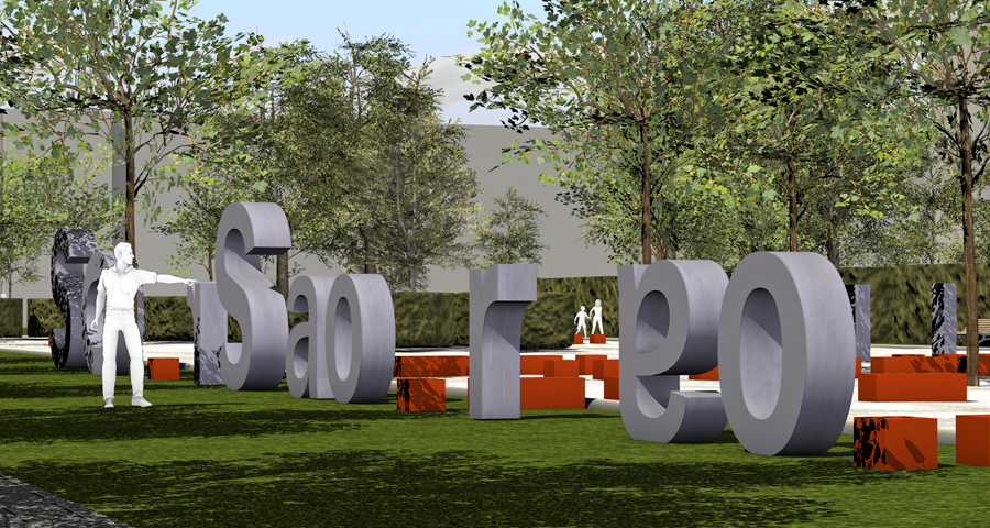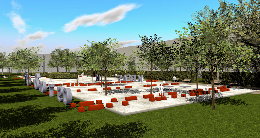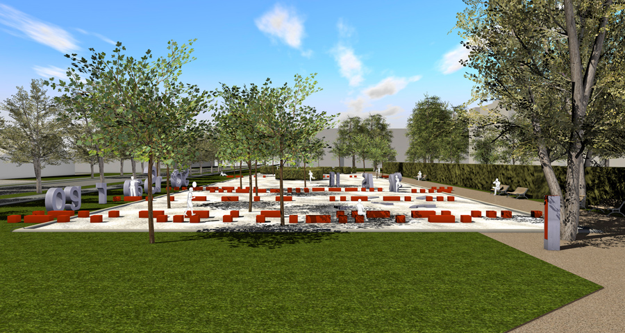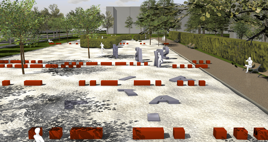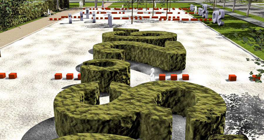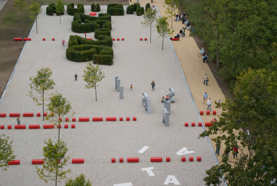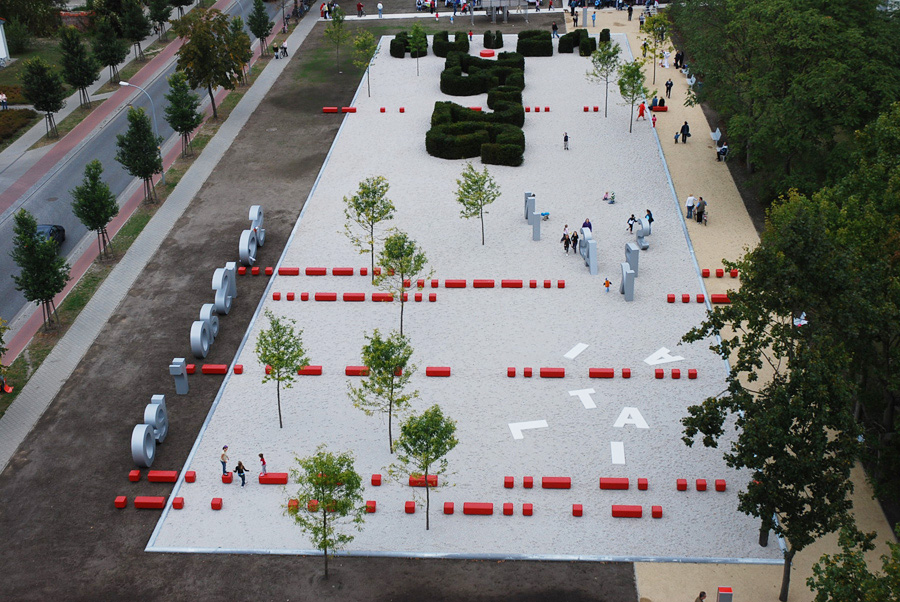 Die Stellung der roten Bänke im Freiraumprojekt entspricht dem Morsecode.